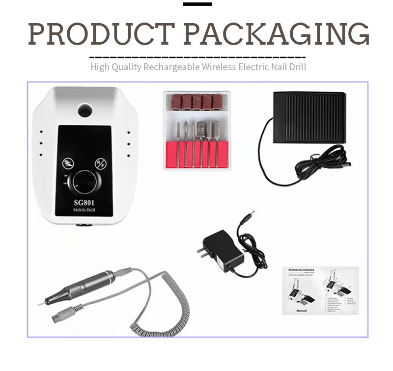 De inhoud van dit elektrische draagbare gelnagelboorpakket met 35.000 tpm bestaat uit een schuurpen, een USB-oplaadkabel, een productinstructiehandleiding en een lichtgewicht en draagbare doos.