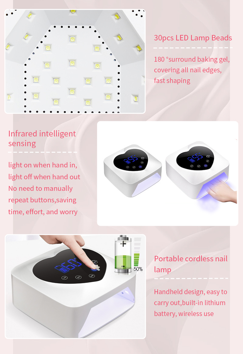 Het product zorgt voor een gelijkmatige lijmdroging zonder krimp. De dubbele lichtbronnen zorgen voor een zachte verwarming om verkleuring van de handen en vermoeide ogen te voorkomen, geschikt voor zowel handen als voeten, en leveren opmerkelijk snelle droogresultaten op.