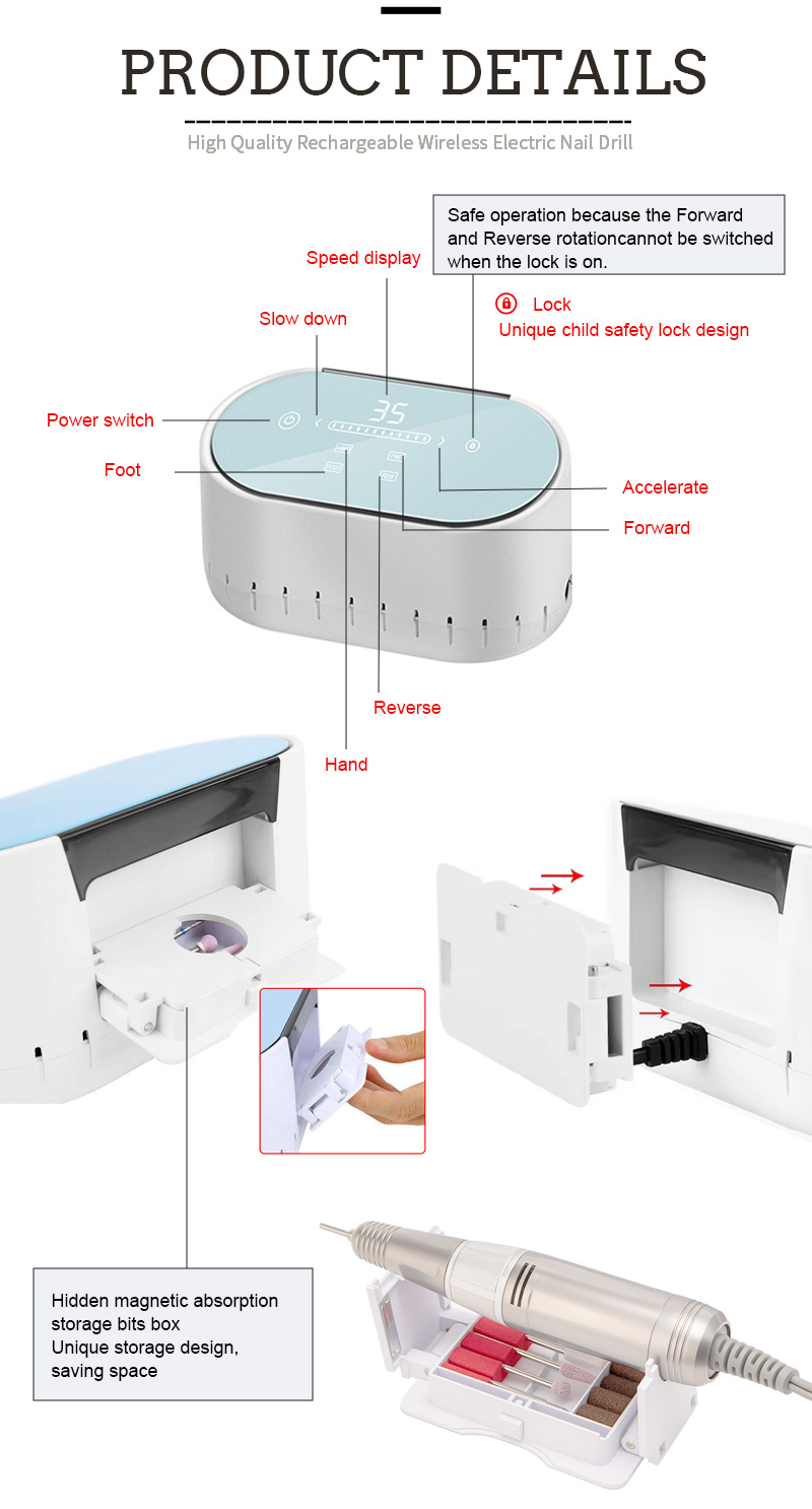 Oplaadbare nagelboorset met krachtig handstuk 45 W 35000 tpm