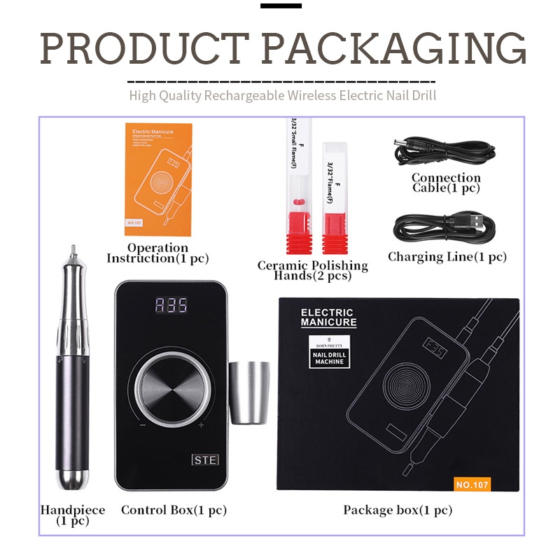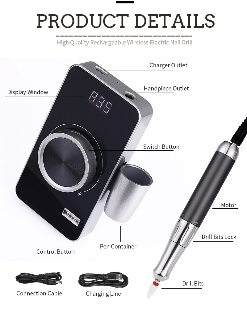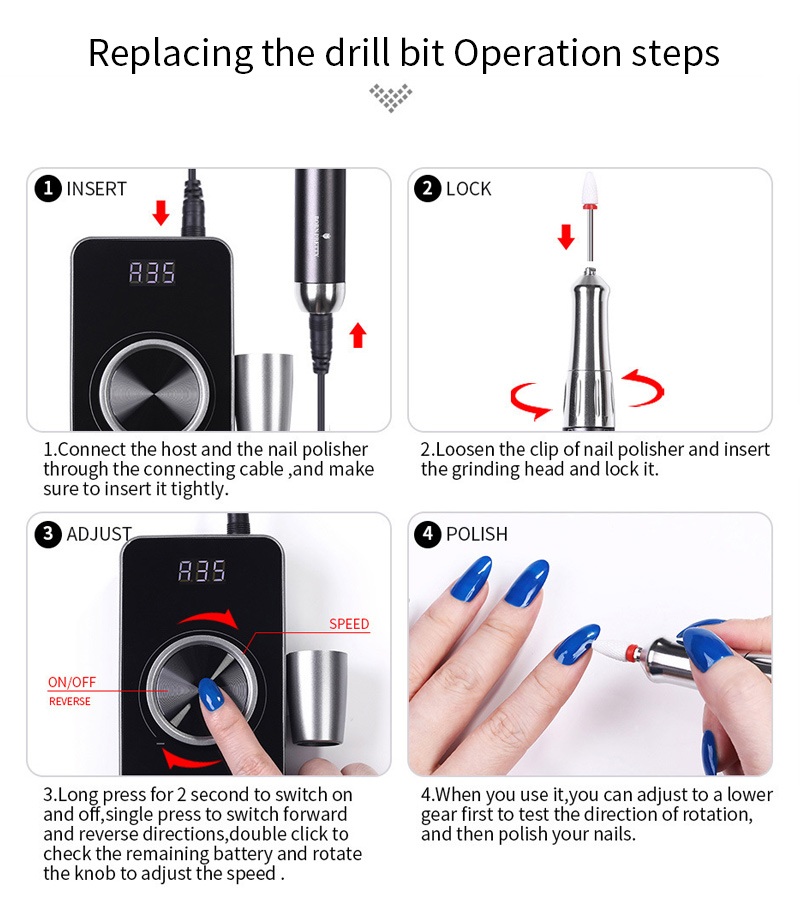 Deze exfoliërende 35.000 rpm elektrische nagelboorvervangingsmethode, dat wil zeggen, aansluiten en uittrekken, eenvoudig en handig, vervanging kan na voltooiing worden gebruikt.