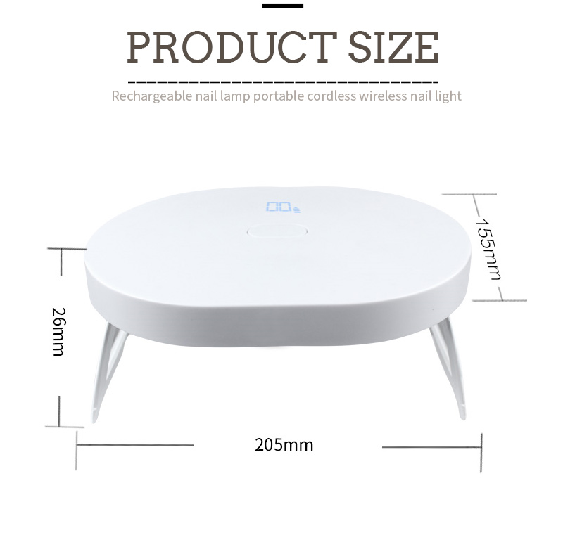 De afmetingen van de opvouwbare mini-nageldrooglamp zijn 205 mm lang, 155 mm breed en 26 mm hoog, met een grote capaciteit en de mogelijkheid om zowel handen als voeten te gebruiken, wat erg handig is.
