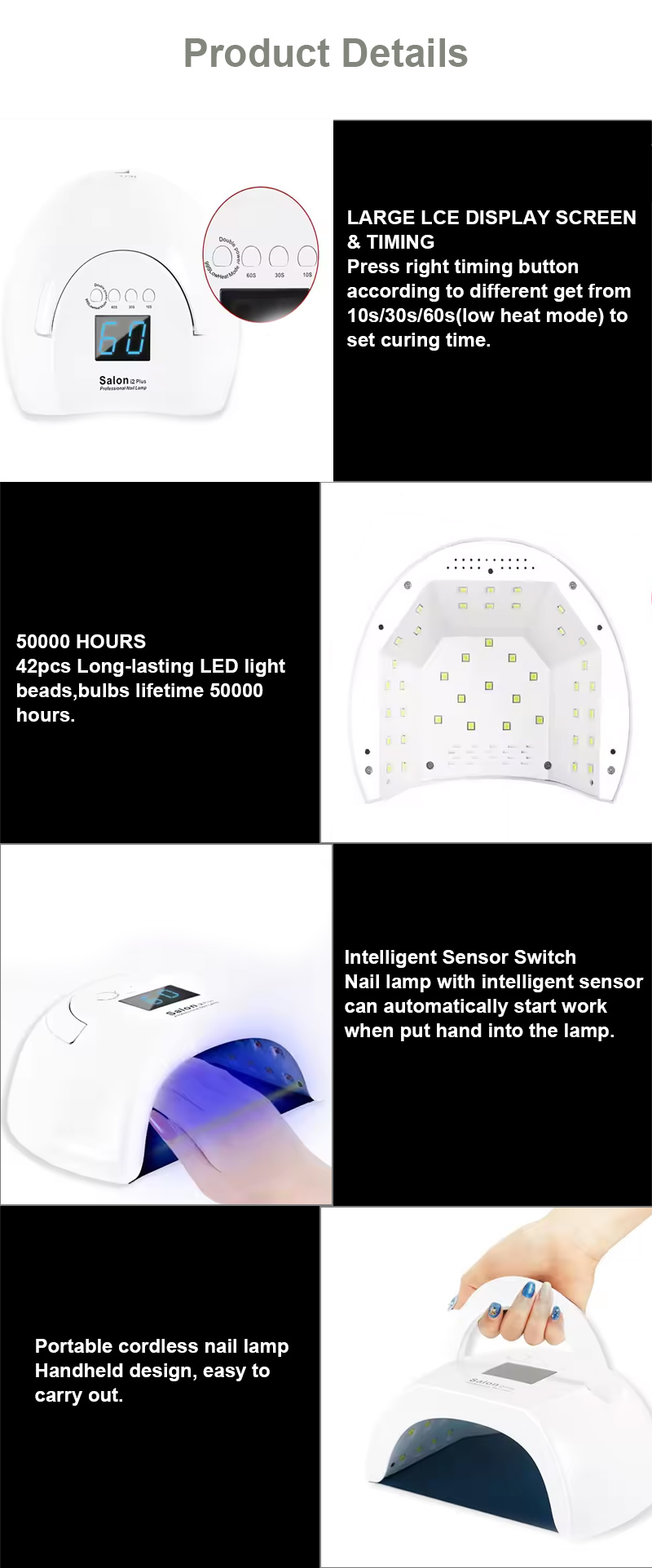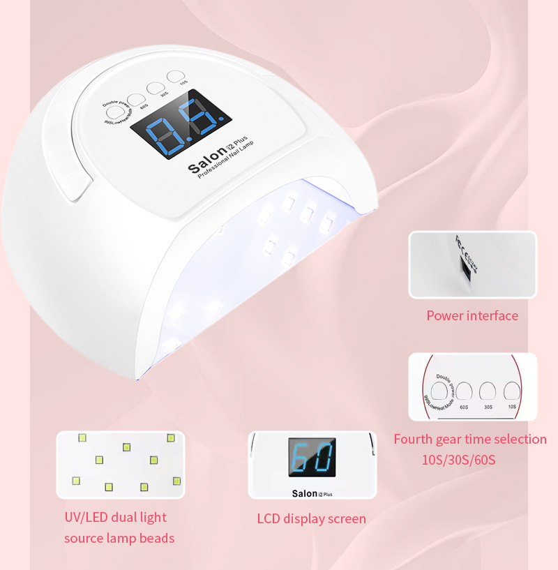 Het product zorgt voor een gelijkmatige lijmdroging zonder krimp. De dubbele lichtbronnen zorgen voor een zachte verwarming om verkleuring van de handen en vermoeide ogen te voorkomen, geschikt voor zowel handen als voeten, en leveren opmerkelijk snelle droogresultaten op.