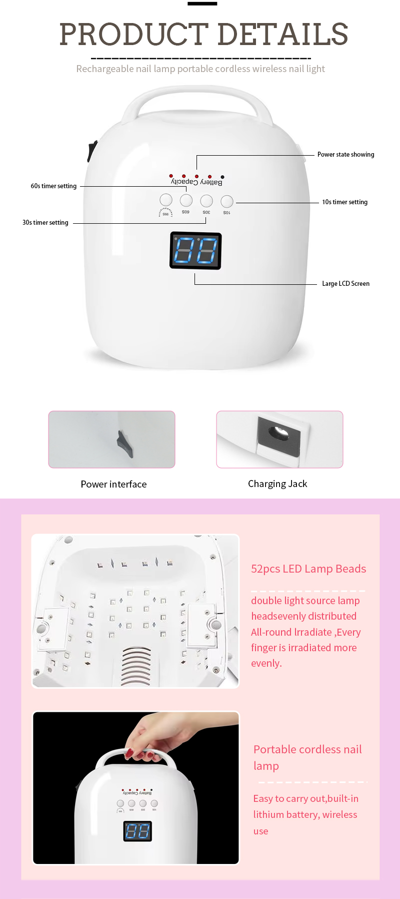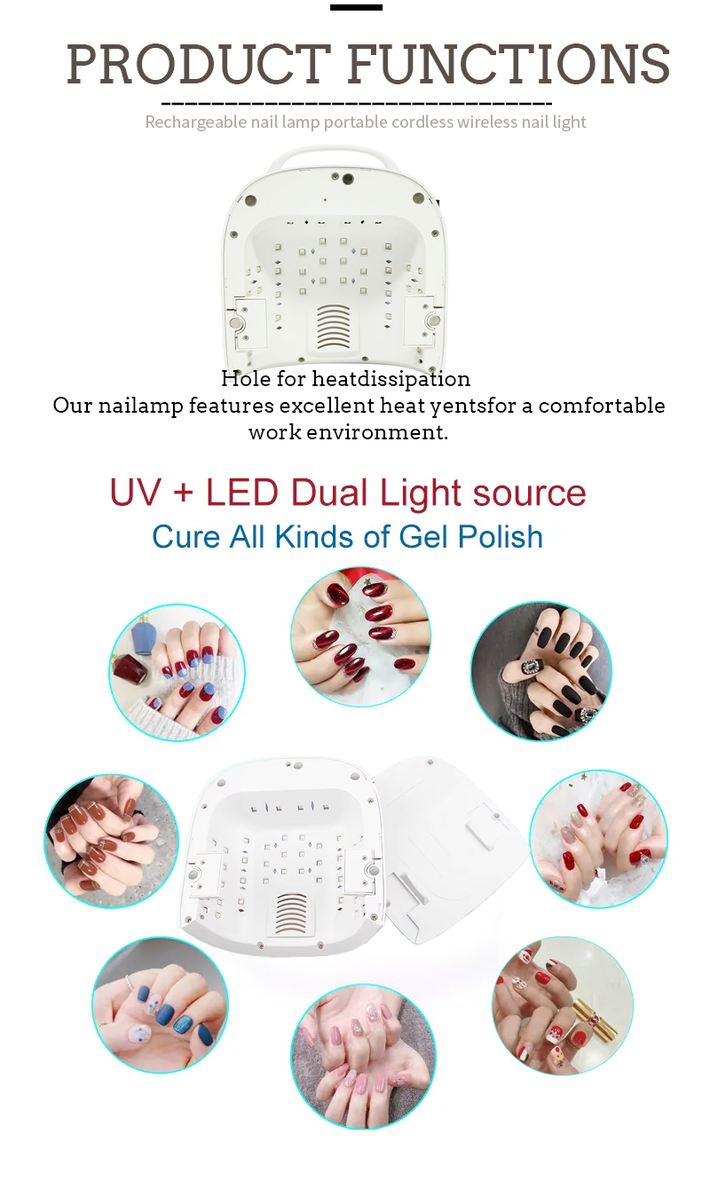 Het product zorgt voor een gelijkmatige lijmdroging zonder krimp. De dubbele lichtbronnen zorgen voor een zachte verwarming om verkleuring van de handen en vermoeide ogen te voorkomen, geschikt voor zowel handen als voeten, en leveren opmerkelijk snelle droogresultaten op.