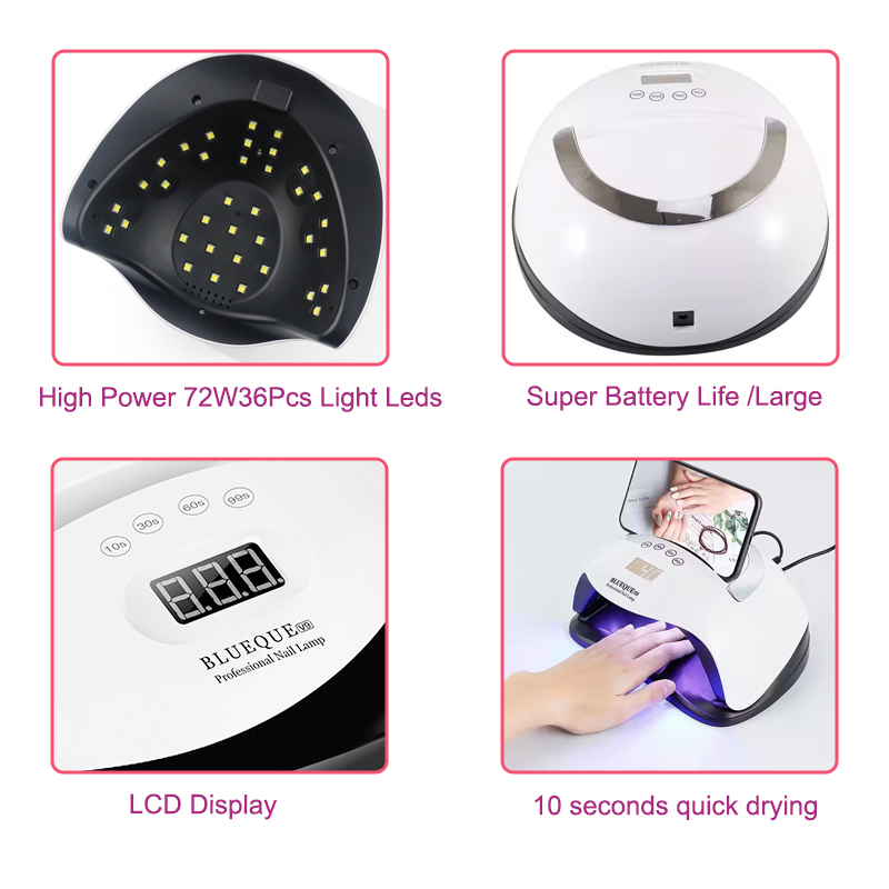 De hoogwaardige nagellamp met timerfunctie zorgt voor een gelijkmatige droging van de lijm zonder krimp. De dubbele lichtbronnen zorgen voor een zachte verwarming om verkleuring van de handen en vermoeide ogen te voorkomen, geschikt voor zowel handen als voeten, en leveren opmerkelijk snelle droogresultaten op.