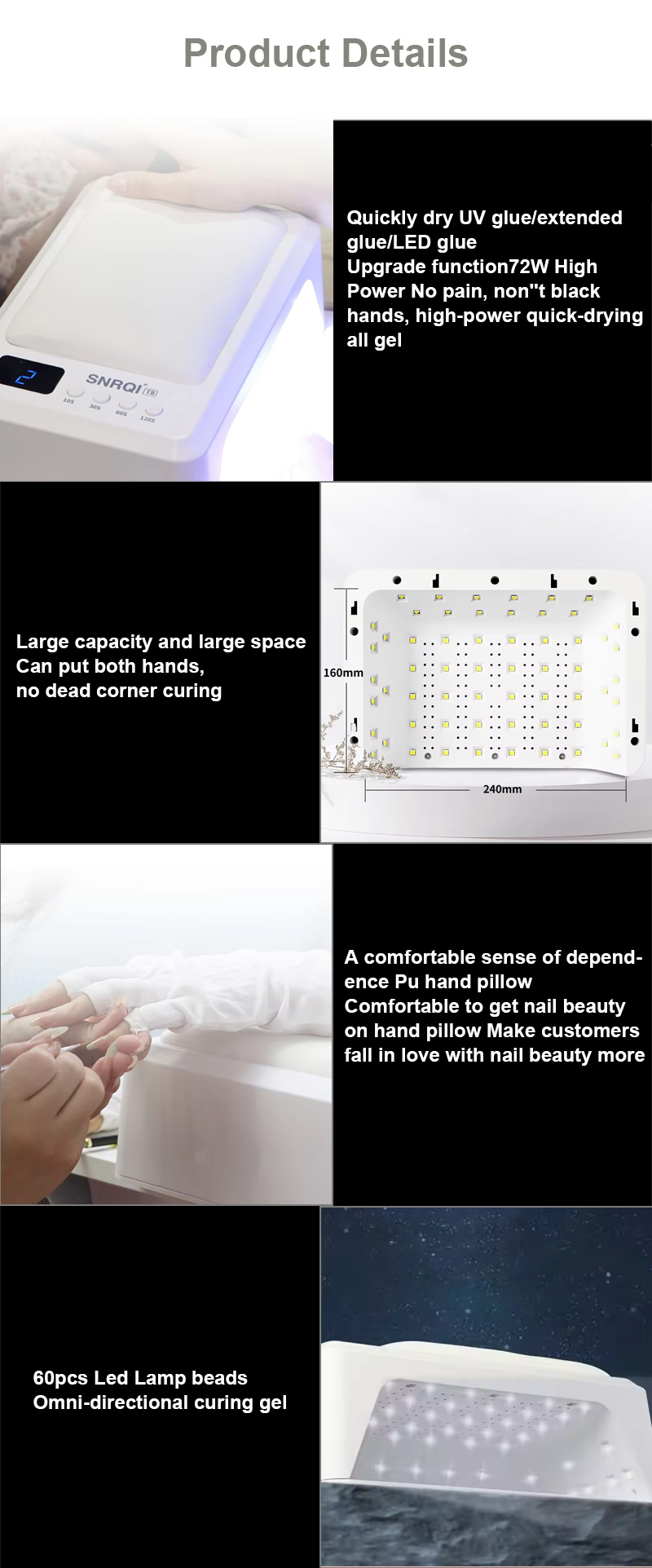 Het product zorgt voor een gelijkmatige lijmdroging zonder krimp. De dubbele lichtbronnen zorgen voor een zachte verwarming om verkleuring van de handen en vermoeide ogen te voorkomen, geschikt voor zowel handen als voeten, en leveren opmerkelijk snelle droogresultaten op.
