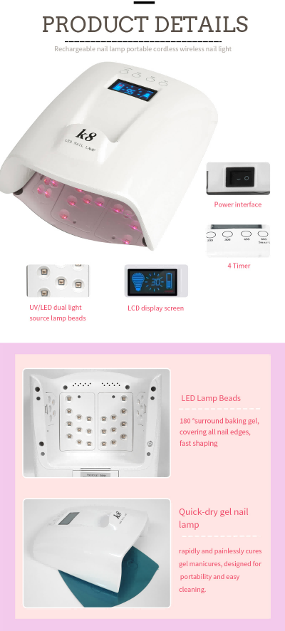 Nageldrooglamp met grote capaciteit en handvat zorgt voor een gelijkmatige droging van de lijm zonder krimp. De dubbele lichtbronnen zorgen voor een zachte verwarming om verkleuring van de handen en vermoeide ogen te voorkomen, geschikt voor zowel handen als voeten, en leveren opmerkelijk snelle droogresultaten op.