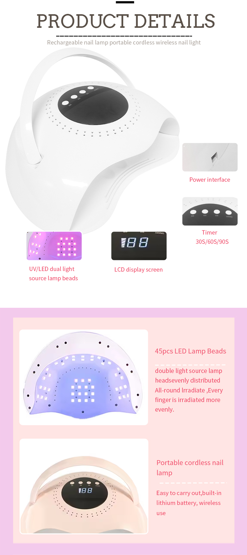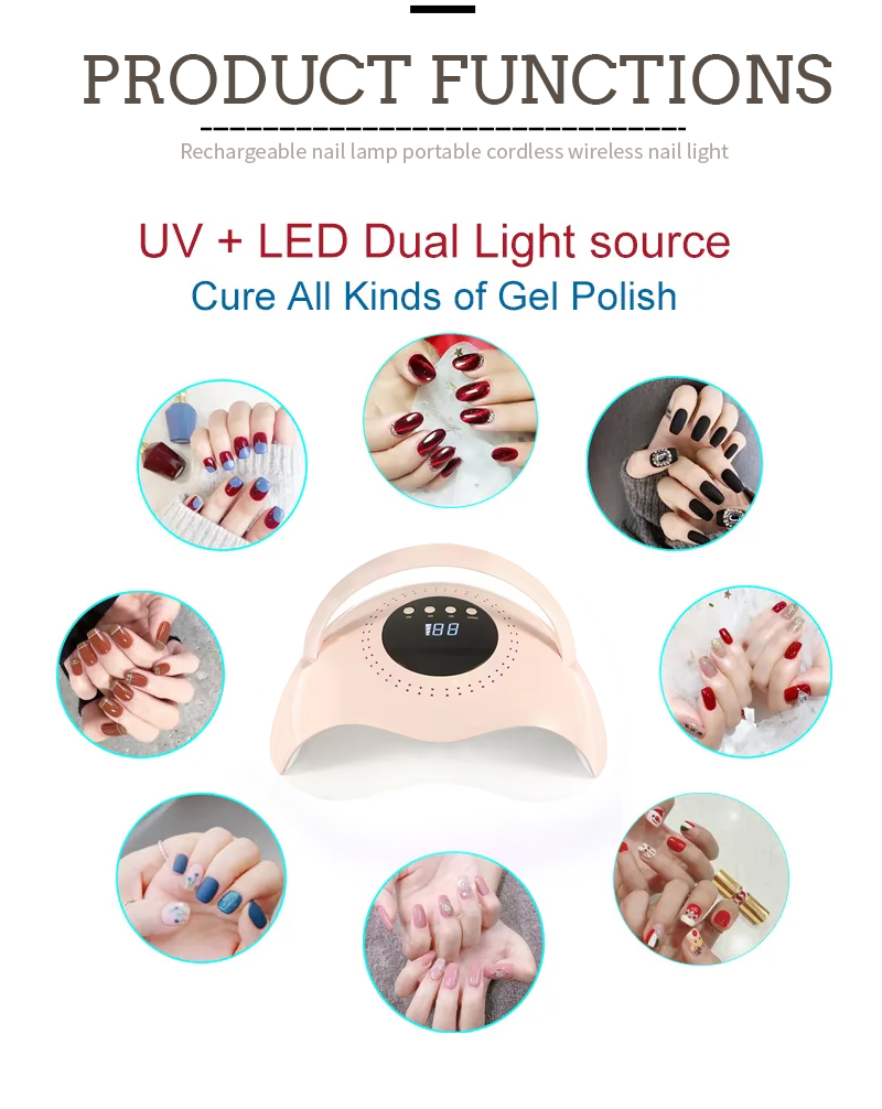 Het product zorgt voor een gelijkmatige lijmdroging zonder krimp. De dubbele lichtbronnen zorgen voor een zachte verwarming om verkleuring van de handen en vermoeide ogen te voorkomen, geschikt voor zowel handen als voeten, en leveren opmerkelijk snelle droogresultaten op.