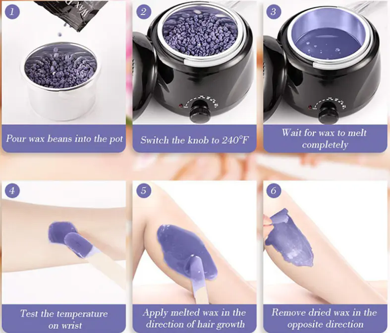 Productafhankelijke wasbedieningsmethode, hoe hoger de temperatuur, hoe sneller de was smelt, hoe lager de temperatuur hoe langzamer de was smelt, giet eerst in de juiste hoeveelheid depilerende wasbonen, verwarmen tot de wasbonen smelten, vervolgens depilerende delen van de uniform gecoate afwijzingswas en uiteindelijk tegen de richting van haargroei af.