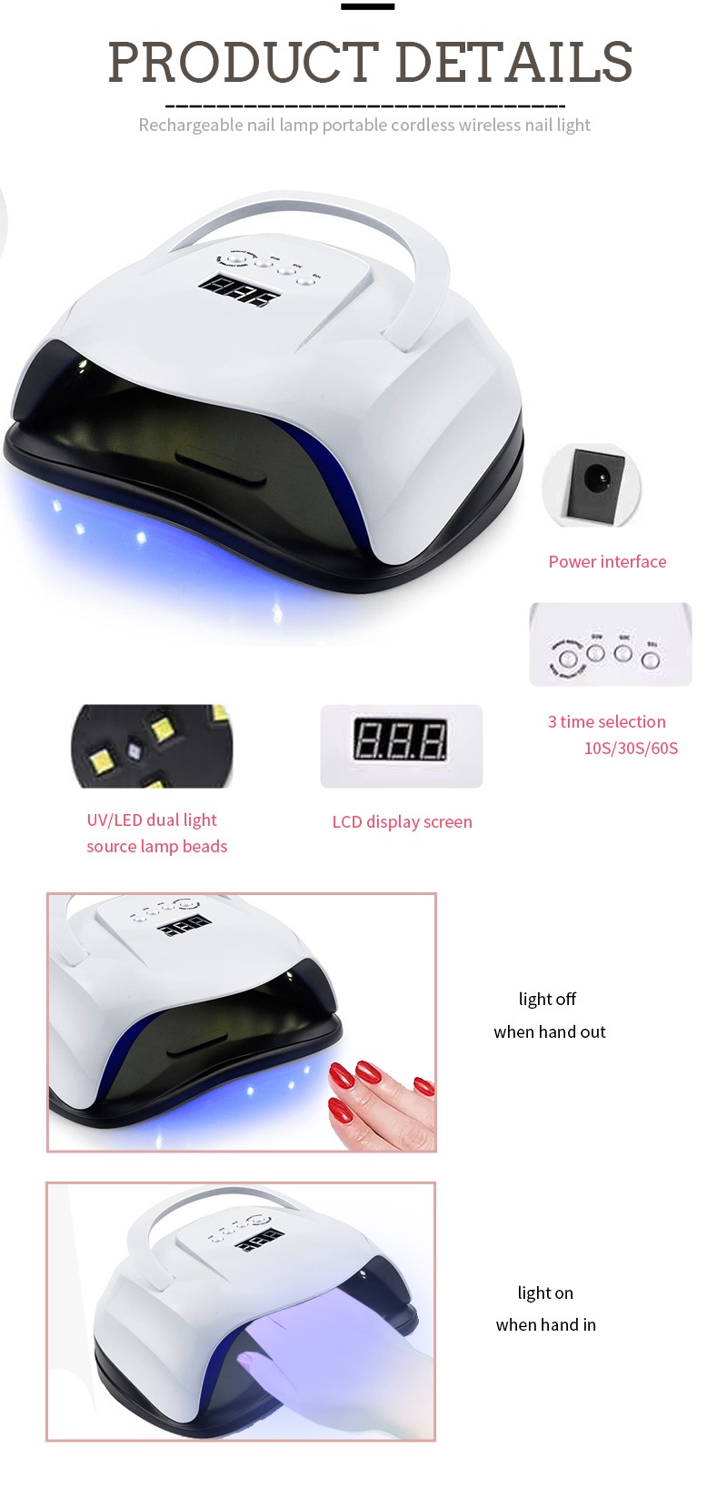 De draagbare nageldrooglamp is voorzien van slimme infraroodsensortechnologie die automatisch oplicht wanneer de handen dichterbij komen en uitgaat wanneer de handen weggaan - waardoor het gedoe van het herhaaldelijk indrukken van knoppen wordt geëlimineerd en tijd en moeite worden bespaard. Krachtige baklijm vereist geen lange wachttijd, wat zowel tijd als moeite bespaart.