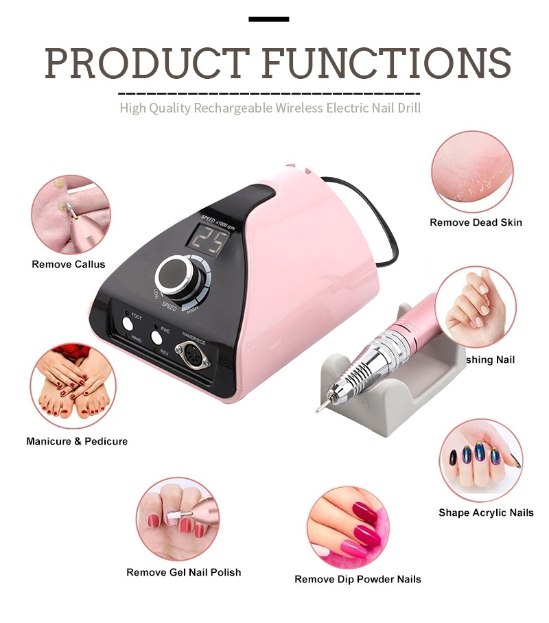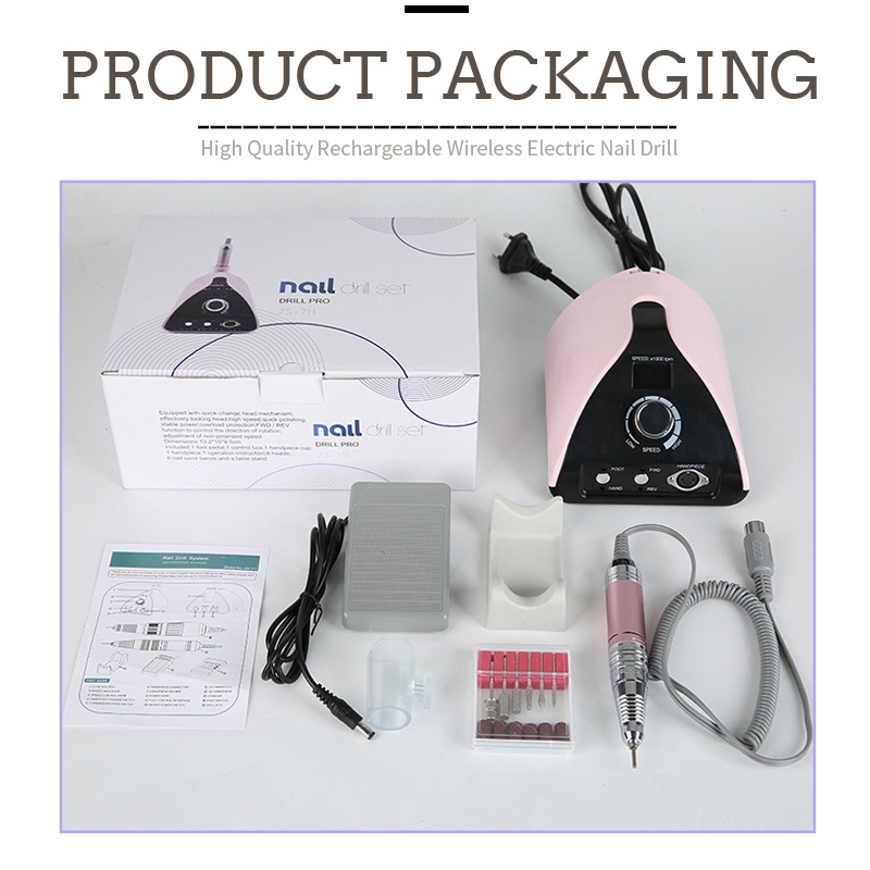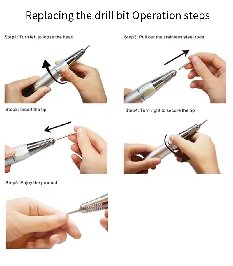 Deze professionele draagbare nagelboormachine 35.000 tpm vervangende boorbedieningsmethode, dat wil zeggen, aansluiten en uittrekken, eenvoudig en handig, vervanging kan na voltooiing worden gebruikt.