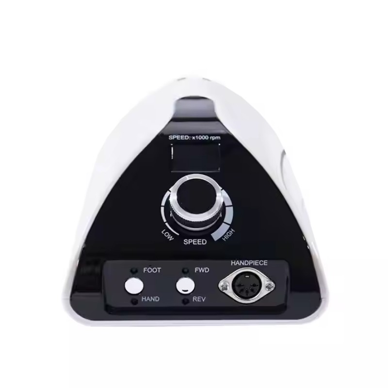 Het displayontwerp van deze professionele draagbare nagelboormachine van 35.000 tpm heeft een aan/uit-schakelaar en vooruit/achteruit draaien voor een totaal van activering met één knop, een snellaadaansluiting aan de onderkant, een vervangbare booraansluiting aan de bovenkant en een in drie standen instelbare snelheid om aan verschillende behoeften te voldoen.