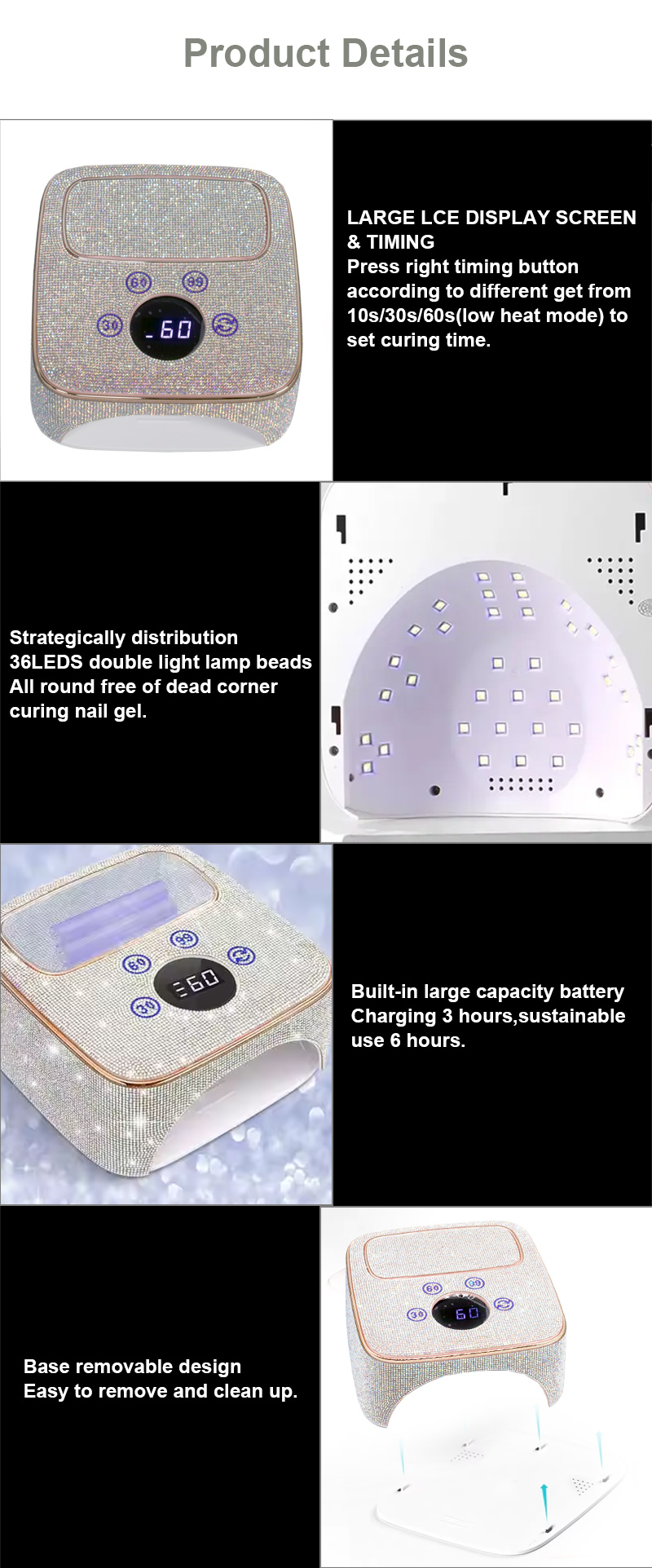 Het product zorgt voor een gelijkmatige lijmdroging zonder krimp. De dubbele lichtbronnen zorgen voor een zachte verwarming om verkleuring van de handen en vermoeide ogen te voorkomen, geschikt voor zowel handen als voeten, en leveren opmerkelijk snelle droogresultaten op.