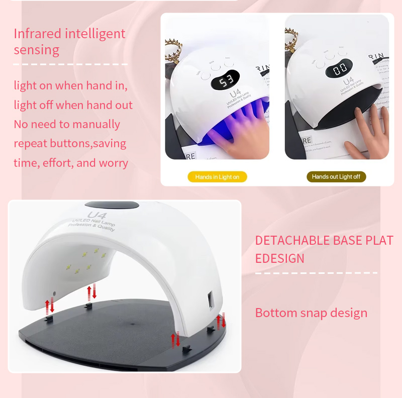 3)De oplaadbare nageldrogerlamp draadloos met hartvormige 72W heeft afneembare snapstructuur bodemplaat, hoeft alleen maar terug te duwen, deze kan worden verwijderd, handig voor interne reinigingsvlekken.