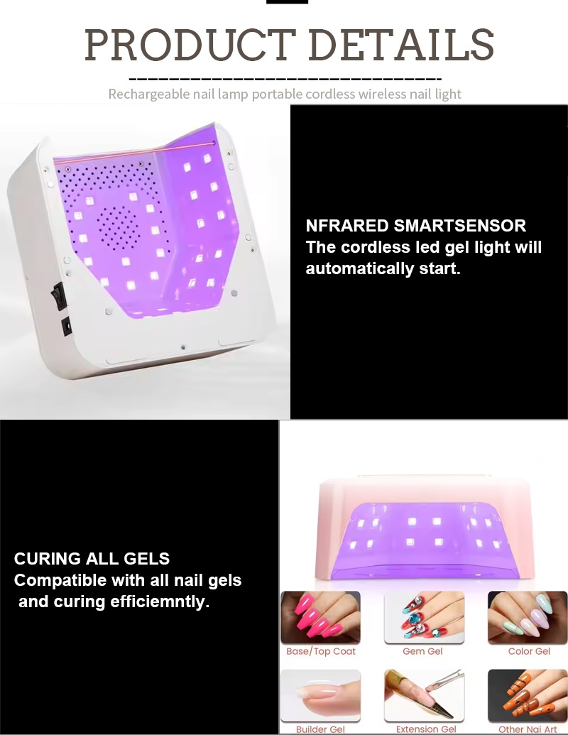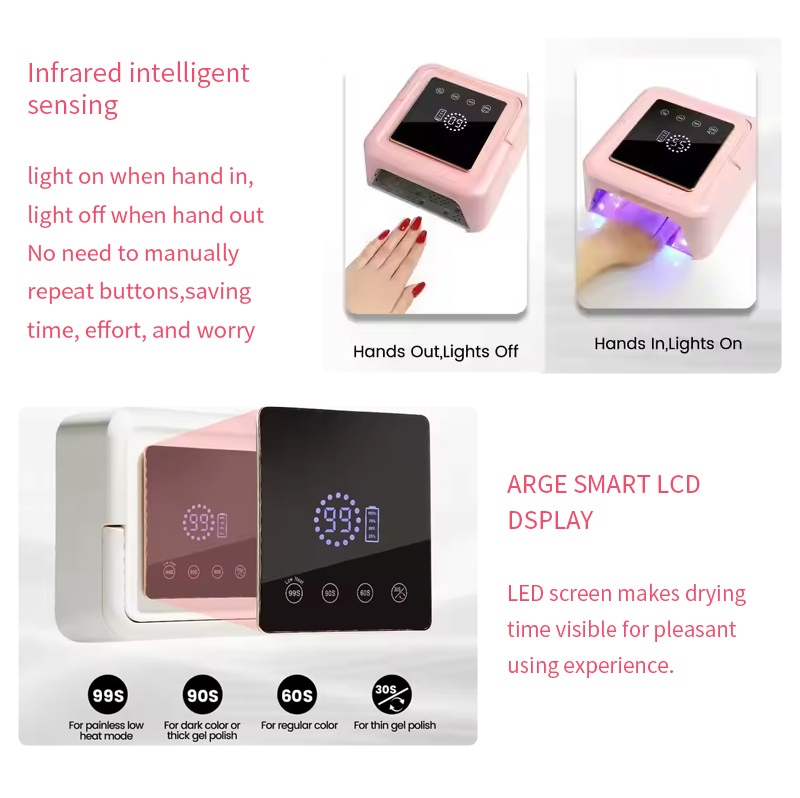 De vierkante nageldrooglamp is voorzien van slimme infraroodsensortechnologie die automatisch oplicht wanneer de handen dichterbij komen en uitgaat wanneer de handen weggaan - waardoor het gedoe van het herhaaldelijk indrukken van knoppen wordt geëlimineerd en tijd en moeite worden bespaard. Krachtige baklijm vereist geen lange wachttijd, wat zowel tijd als moeite bespaart.