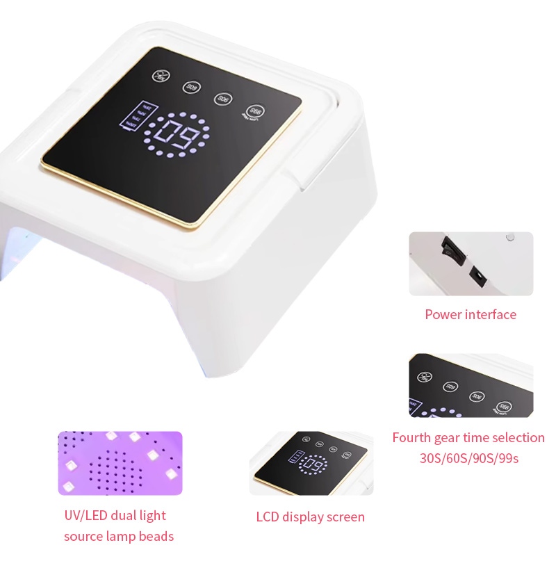 De vierkante nageldrooglamp zorgt voor een gelijkmatige droging van de lijm zonder krimp. De dubbele lichtbronnen zorgen voor een zachte verwarming om verkleuring van de handen en vermoeide ogen te voorkomen, geschikt voor zowel handen als voeten, en leveren opmerkelijk snelle droogresultaten op.